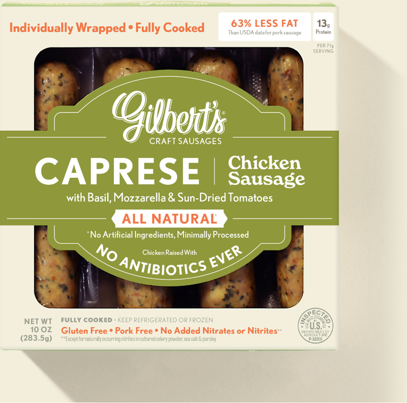 The Fresh Flavors of an Italian Summer. Try Gilbert’s Caprese Chicken Sausage sautéed on pizza or in your favorite pasta dish, or grill and enjoy it on the bun with basil, mozzarella pearls and balsamic glaze.